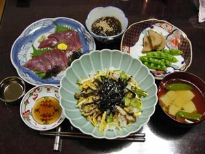 廻しかけて、上に錦糸卵と絹さやとそらまめとを乗せ、焼き穴子と青紫蘇の線切りを